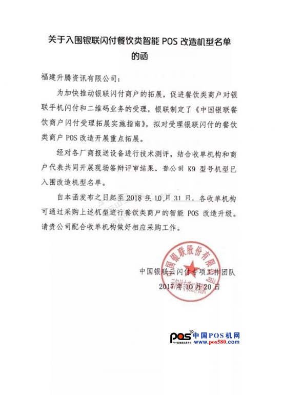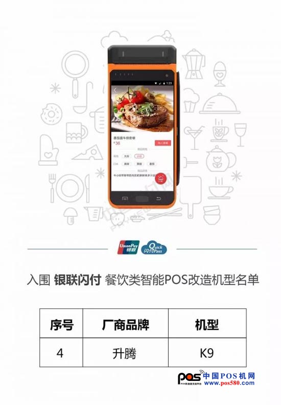 核心提示近日,銀聯(lián)發(fā)布《銀聯(lián)閃付餐飲類智能POS改造機型名單》,僅10家POS終端廠家入圍。升騰智能POS K9憑借強性能、高安全、好口碑的優(yōu)勢榮耀上榜,助力銀聯(lián)拓展餐飲類重點商戶,推廣銀聯(lián)手機閃付和二維碼業(yè)務(wù)?! 〈舜蜬9