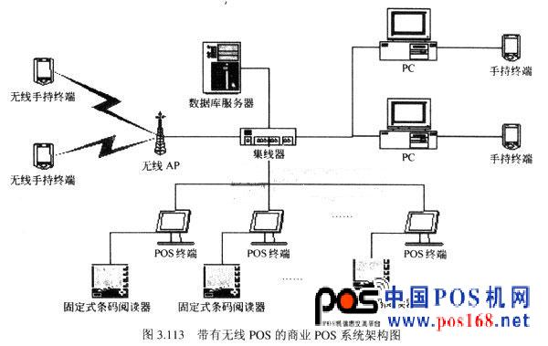 在一個完整的移動POS機系統(tǒng)中,無線廣域網(wǎng)擔任著重要角色。它負責接收移動POS機發(fā)送的POS交易請求數(shù)據(jù)包,然后將POS交易請求數(shù)據(jù)包轉發(fā)到銀行無線交易前置機。然后,再接收銀行無線交易前置機發(fā)送的POS交易結果數(shù)據(jù)包,最后發(fā)送POS交易結果數(shù)據(jù)包到移動POS機,接下來的工作就在移動POS機端完成。圖3.113是一個完整的帶有移動POS機的商業(yè)POS系統(tǒng)架構圖。